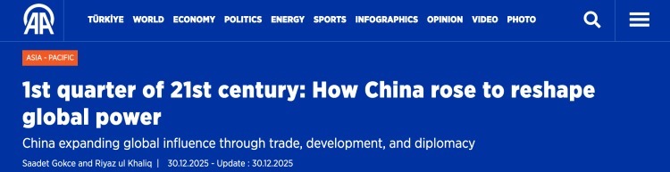 土耳其阿纳多卢通讯社12月30日在其网站上发表文章称,21世纪的前25年,中国快速崛起成为定义时代特征的关键变量。如今,中国已成为重塑全球格局的重要力量之一,在贸易、金融、外交和科技等领域发挥影响力,并为全球南方国家的发展提供了范例。